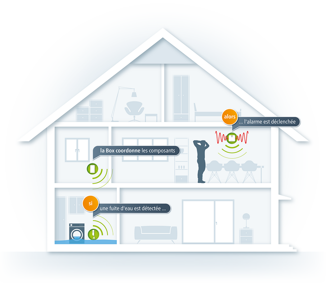 Avec le détecteur de fuite d’eau devolo Home Control, vos alertes vous sont instantanément envoyées par sms (15 notifications sms sont offertes), par email, et/ou via l’application mobile. Vous pouvez réagir à temps et ne plus jamais laisser aucune fuite d’eau dégrader votre intérieur. Sortez tranquille, le détecteur garde un œil vigilant et permanent sur votre maison ! Couplez votre détecteur avec d’autres modules devolo Home Control et profitez pleinement du confort offert par le monde de la domotique. Par exemple, il vous suffit d’associer votre détecteur d’eau avec la prise intelligente placée derrière votre lave-linge, pour que cette dernière déclenche automatiquement l’arrêt de la machine en cas de fuite suspecte détectée dans la pièce.